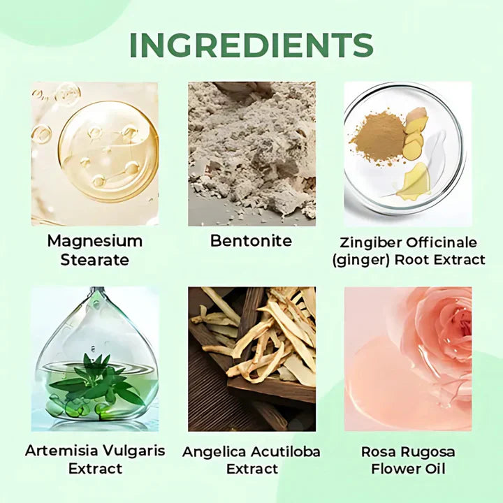 | Ingrediënten | Magnesiumstearaat, Bentoniet, Zingiber Officinale (Gember) Wortelextract, Artemisia Vulgaris Extract, Angelica Acutiloba Extract Rosa Rugosa Bloemolie |